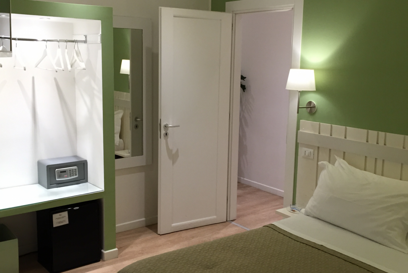Questa camera ha un’ampiezza di circa 14 mq.Dispone di letto matrimoniale.Servizi: balcone, climatizzatore, WiFi gratuito, bollitore, frigobar, TV LCD schermo piatto, SKY vision gold, bagno privato.